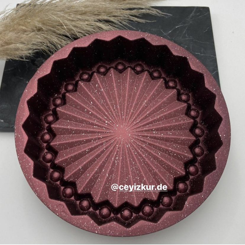 Mit dieser Backform verzaubern Sie Ihre Küche zu einem einzigartigen Schauspiel. Bereiten Sie mit dieser schönen Form leckere Kuchen und Torten. Die Form ermöglicht durch die erhöhten Ränder auch Obst zu platzieren oder mit leckeren Soßen die Oberfläche zu verzieren. Durch die Antihaftbeschichtung ist es besonders einfach den fertigen Kuchen aus der Form herauszunehmen. Die außergewöhnliche Form zeichnet sich nach dem Backen genau ab. Unsere Empfehlung: Vor dem Befüllen mit flüssiger Butter auspinseln, nach dem Backen 10 Min. auskühlen lassen, dann die Form stürzen. Auch für Desserts geeignet. Die Backform hat einen Durchmesser von 24cm. Die Höhe beträgt 10cm. Wichtig: Beim Versand wird eine beliebige Farbe dem Kunden zugeschickt. Eine Auswahl der Farbe ist nicht möglich. Weitere und ähnliche Produkte zum Thema Backen finden Sie im Menü unter „Backen“.