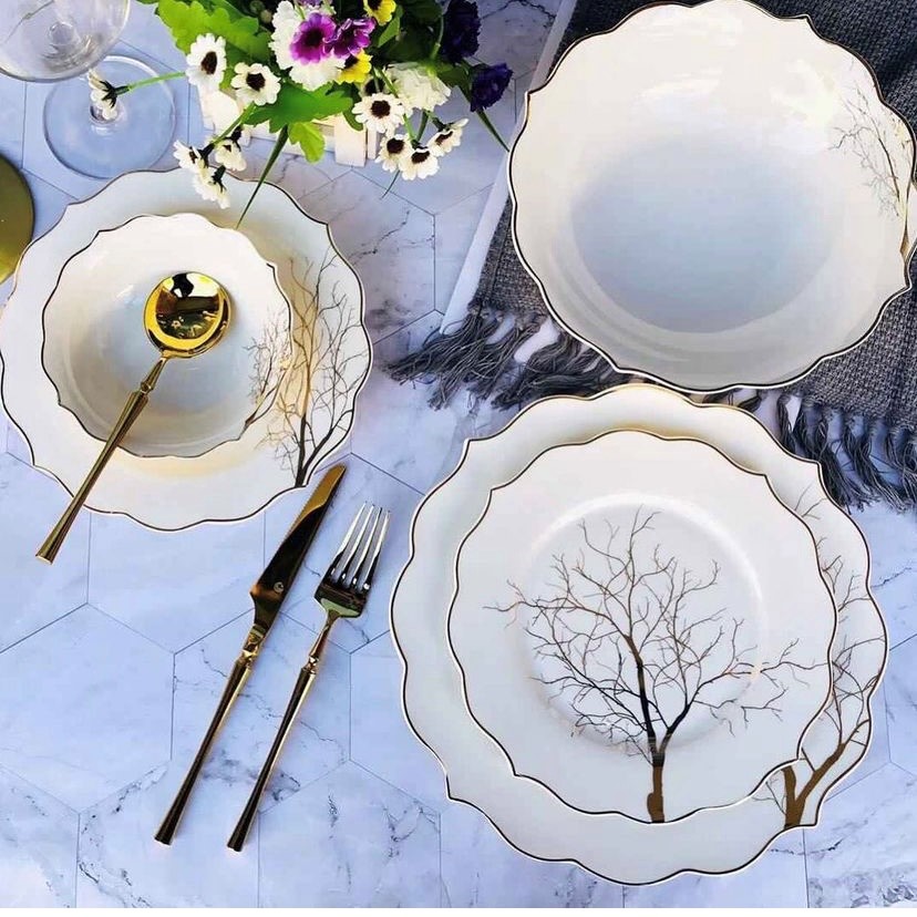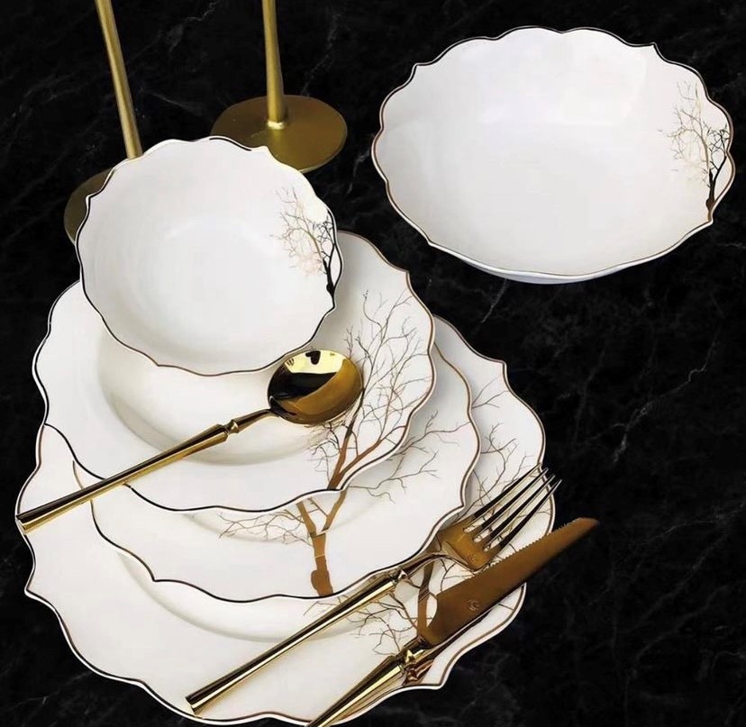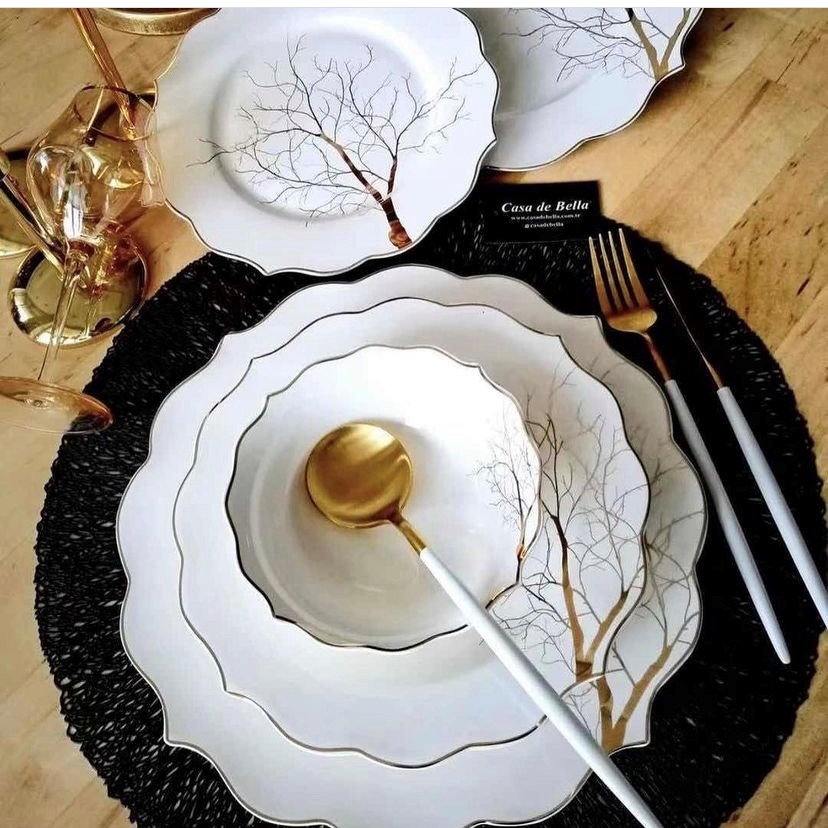 Geschirr Set mit Golddetails für 6 Personen.