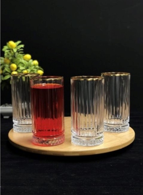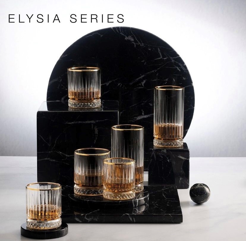Die Longdrinkgläser aus der Serie „Elysia“ von Pasabahce sind von langen senkrechten Linien geschmückt. Der Boden der Gläser ist mit einem aufregenden Muster aus Rauten verziert und der Rand vergoldet.