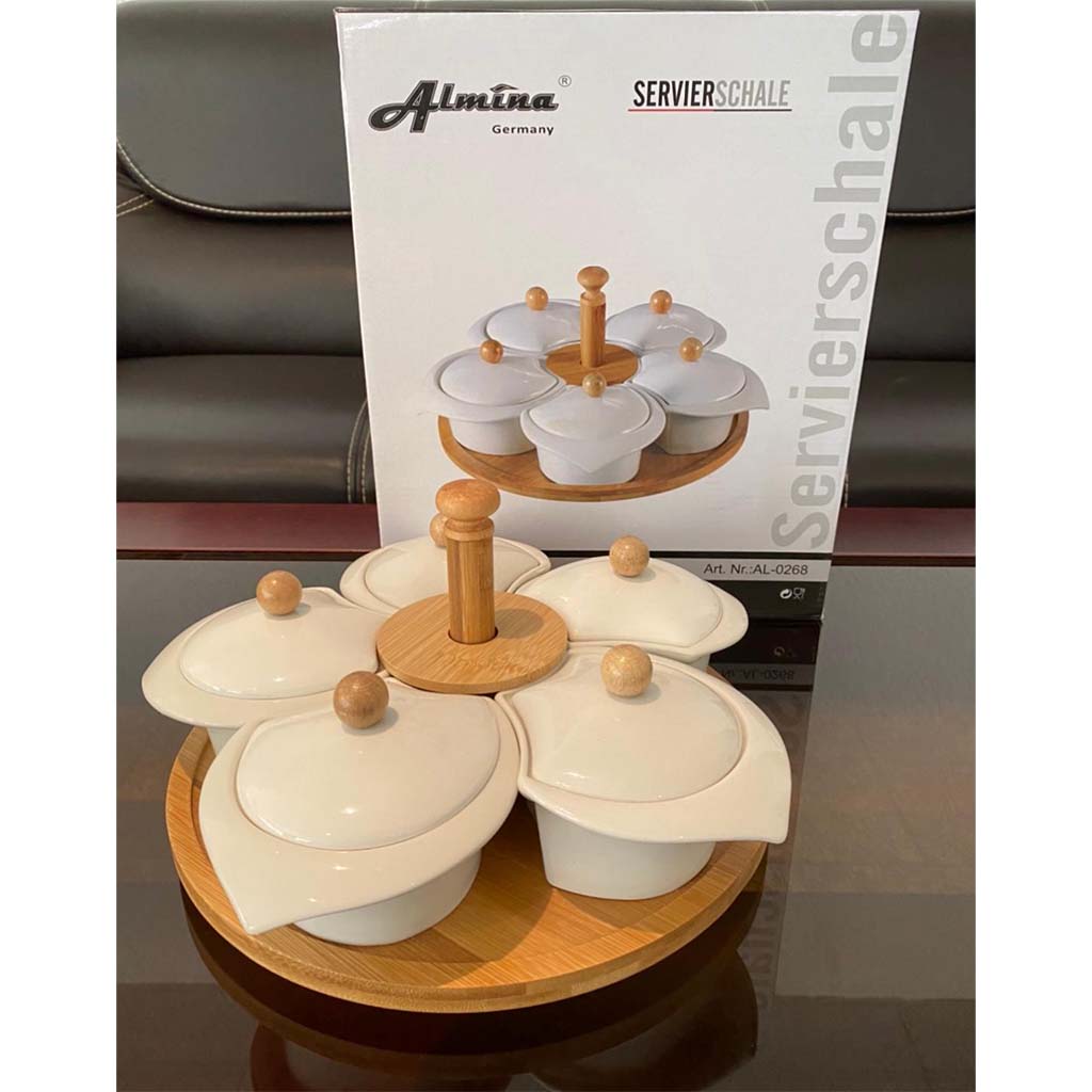 Servierschale für Snacks mit Deckel weiss drehbar