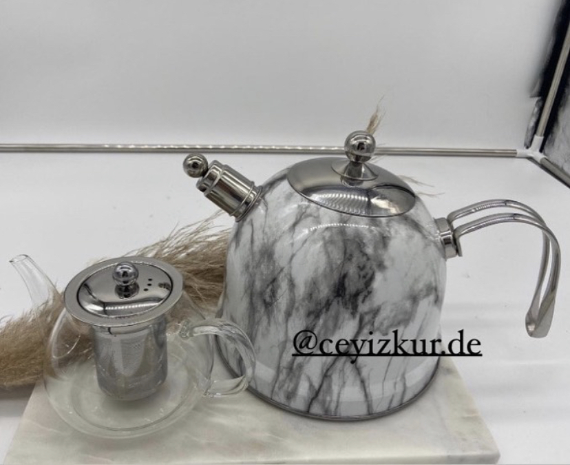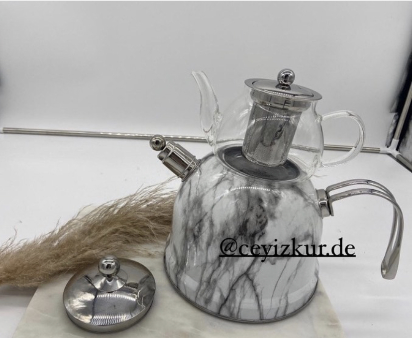 Die weiße Teekanne aus der Marmorserie überzeugt nicht nur mit Ihrem aussehen, sondern auch mit Ihrer Größe und Ihrer Liebe zum Detail. Die obere Kanne (800ml) ist aus einem Hitzebeständigem Glas und somit auch perfekt für den Einzelgebrauch. Durch den vorhandenen Teesieb (Edelstahl) können Sie selber entscheiden, wie intensiv Ihr Tee werden soll. Die untere Kanne (2.5 Liter) besteht aus Edelstahl und ist für jede Herdplatte geeignet inkl. Induktionsplatten. Auch diese eignet sich perfekt für den Einzelgebrauch. Sobald das Wasser am kochen ist ertönt ein leises Pfeifen und Ihr Tee ist servierbereit.