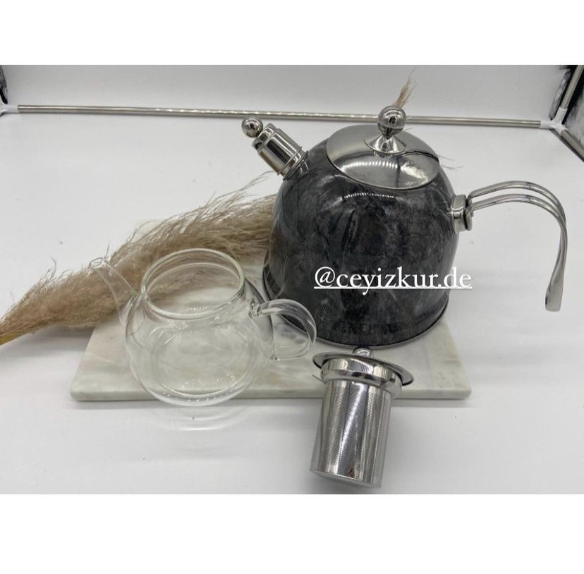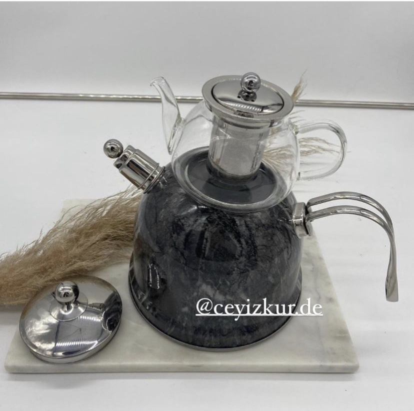 Die graue Teekanne aus der Marmorserie überzeugt nicht nur mit Ihrem aussehen, sondern auch mit Ihrer Größe und Ihrer Liebe zum Detail. Die obere Kanne (600ml) ist aus einem Hitzebeständigem Glas und somit auch perfekt für den Einzelgebrauch. Durch den vorhandenen Teesieb (Edelstahl) können Sie selber entscheiden, wie intensiv Ihr Tee werden soll. Die untere Kanne (3.0 Liter) besteht aus Edelstahl und ist für jede Herdplatte geeignet inkl. Induktionsplatten. Auch diese eignet sich perfekt für den Einzelgebrauch. Sobald das Wasser am kochen ist ertönt ein leises Pfeifen und Ihr Tee ist servierbereit.